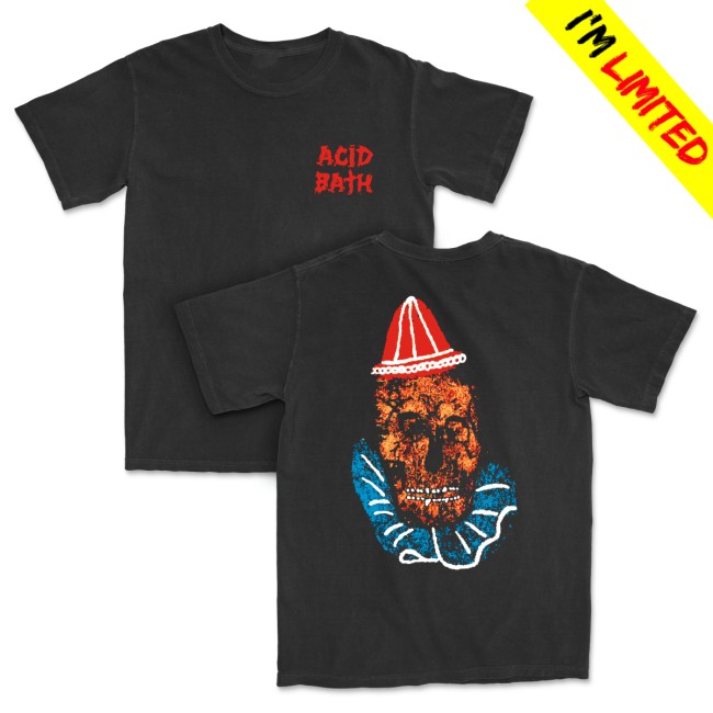 The Clown Skull Tee from the official store of Acid Bath is a striking piece of band merchandise that reflects the dark, disturbing aesthetic associated with the legendary sludge metal group. The T-shirt features a clown skull graphic, blending eerie carnival imagery with macabre skull artwork, capturing the unsettling and chaotic visual style often linked to the band’s underground metal legacy.
