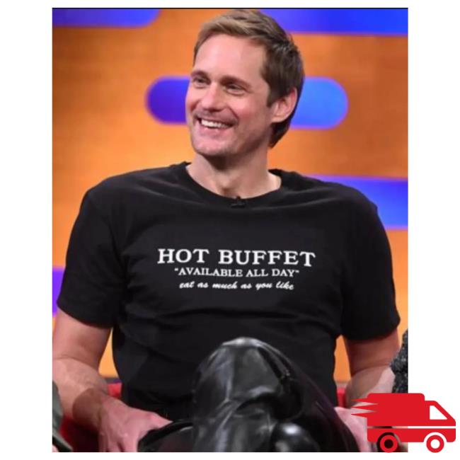 “Alexander Skarsgard Wearing Hot Buffet Available All Day Eat As Much As You Like Shirt is a fun and quirky t-shirt for fans, featuring a humorous and eye-catching design inspired by Alexander Skarsgard. Made from soft, high-quality fabric, this shirt offers all-day comfort and durability. Perfect for casual wear, parties, or showing off your playful side, the Hot Buffet Available All Day Eat As Much As You Like Shirt combines bold style with a sense of humor, making it a must-have addition to any wardrobe.”