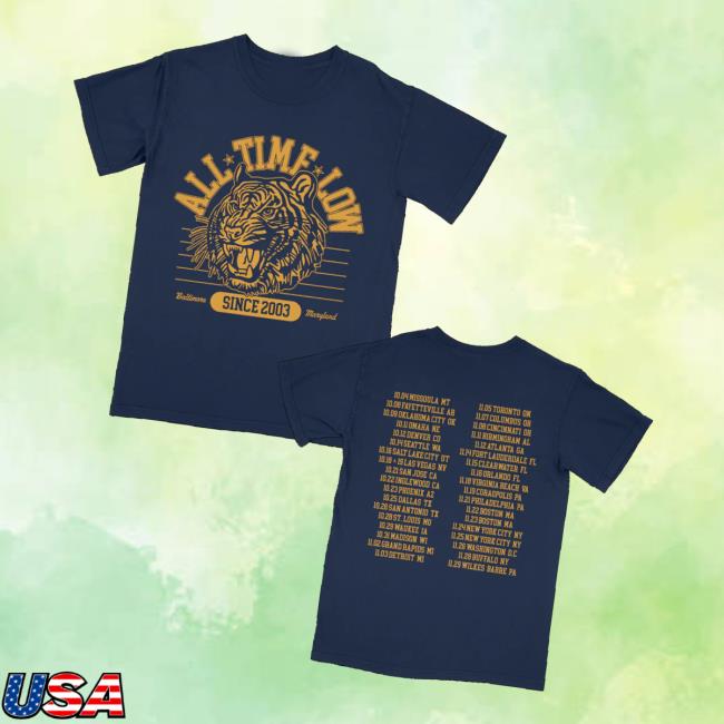 The All Time Low Store Merch All Time Low Tiger Dateback Tee is a standout piece for fans who love to relive the excitement of the band’s live shows. Made from soft, high-quality cotton, this tee ensures all-day comfort with a perfect classic fit. The front features a bold tiger graphic symbolizing strength and energy, while the back lists the official tour dates — a tribute to unforgettable nights on the road. Whether you caught them live or just want to show your support, this shirt is the ultimate addition to any All Time Low fan’s collection.