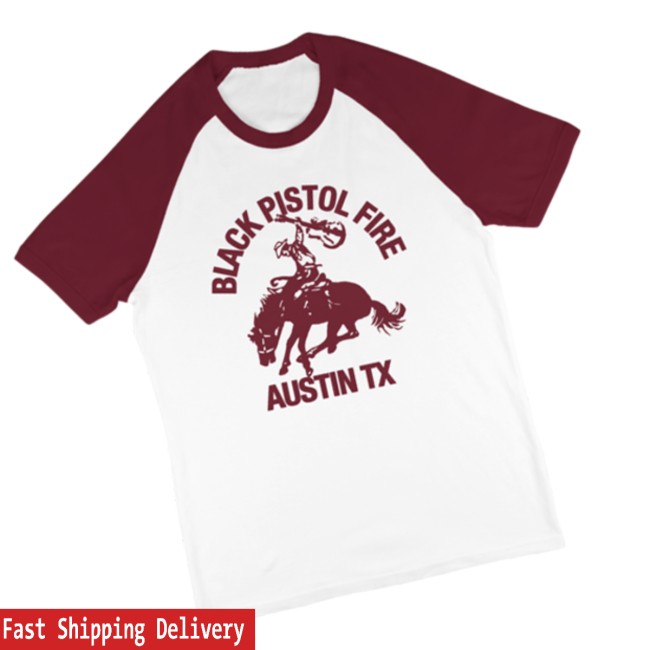 The shirt features a white body with contrasting red raglan sleeves, creating the iconic baseball tee style. The front graphic showcases a cowboy-inspired design along with the band’s name, reflecting the raw, rebellious energy that defines Black Pistol Fire’s music and stage presence.