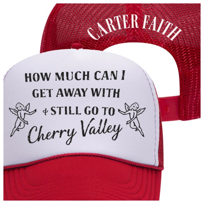 Carter Faith Store Merch Cherry Valley Cherub Hat is a stylish and unique accessory that combines elements of charm and elegance. The hat, available at Carter Faith Store, located in Cherry Valley, is adorned with delightful cherub motifs that add a touch of whimsy to any outfit. Crafted with quality materials and attention to detail, this Cherub Hat is a must-have item for fashion-forward individuals seeking to make a statement with their accessories. The distinctive design of the hat sets it apart from conventional styles, making it a standout piece in any collection. Perfect for adding a touch of flair to both casual and formal ensembles, the Carter Faith Store Merch Cherry Valley Cherub Hat is sure to turn heads and elevate your fashion game