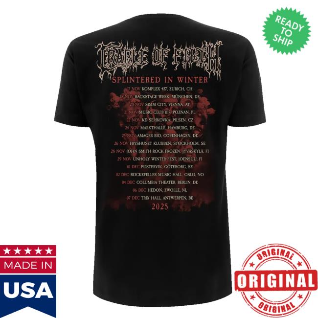 Cradle Of Filth Merch Store Cradle Of Filth Splintered In Winter Tee embodies the band’s dark, gothic metal aesthetic with haunting artwork inspired by the chilling atmosphere of winter. Featuring detailed, high-quality graphics that capture Cradle Of Filth’s iconic visual style, this tee is crafted from soft, durable fabric for lasting comfort. With a classic fit that’s easy to wear and style, it’s an essential piece for fans who want to showcase their devotion to the band while adding a powerful statement to their merch collection.