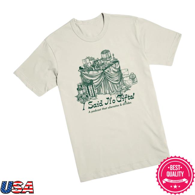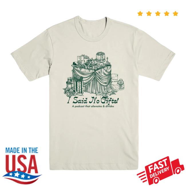 Exactly Right Store Merch I Said No Gifts Alienating And Divisive T-Shirt is a bold and humorous piece perfect for fans of the My Favorite Murder podcast. Made from soft, breathable cotton, this tee features the memorable phrase “I Said No Gifts: Alienating and Divisive,” bringing a playful and witty touch to your casual wardrobe. Its relaxed fit ensures all-day comfort, making it ideal for lounging, everyday wear, or podcast-listening sessions. A must-have for fans who enjoy statement-making merch with a clever, tongue-in-cheek vibe.
