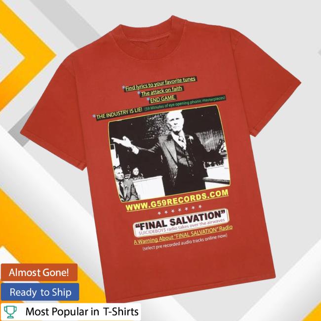 G59records Merch Store G59 Televangelist T-Shirt Red is a bold and striking graphic tee that embodies the edgy, underground aesthetic of G59records. Made from soft, high-quality fabric, this red T-shirt offers a comfortable, relaxed fit for everyday wear. The eye-catching “Televangelist” design adds a powerful visual statement, making it perfect for pairing with jeans, cargos, or layered streetwear outfits. Ideal for casual wear, concerts, or official merch collections, this tee is a must-have for dedicated G59 fans.