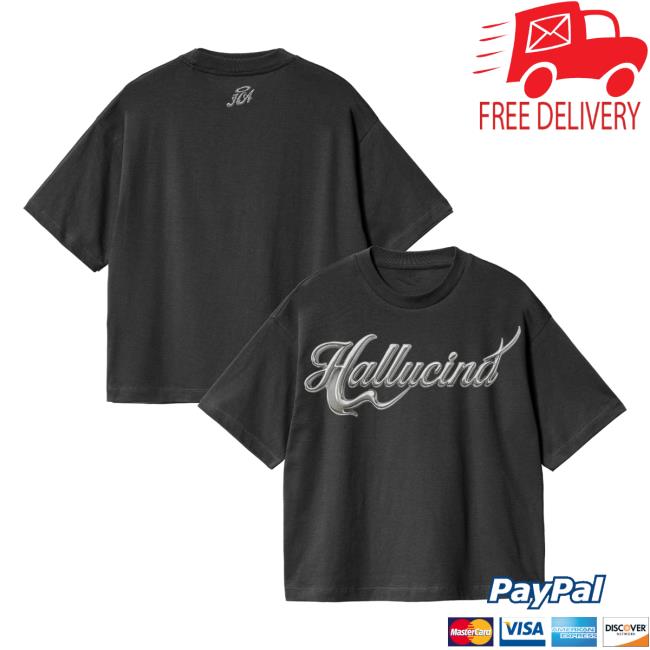 Hallucina Merch Store Black Chrome Text T is a sleek, modern tee that fuses minimalism with striking detail. Featuring bold chrome-text graphics on a deep black canvas, this shirt delivers a high-contrast, futuristic look that stands out effortlessly. Made from soft, breathable fabric, it ensures all-day comfort while elevating any streetwear or casual outfit. A versatile, statement-making essential for fans of Hallucina’s cutting-edge style.