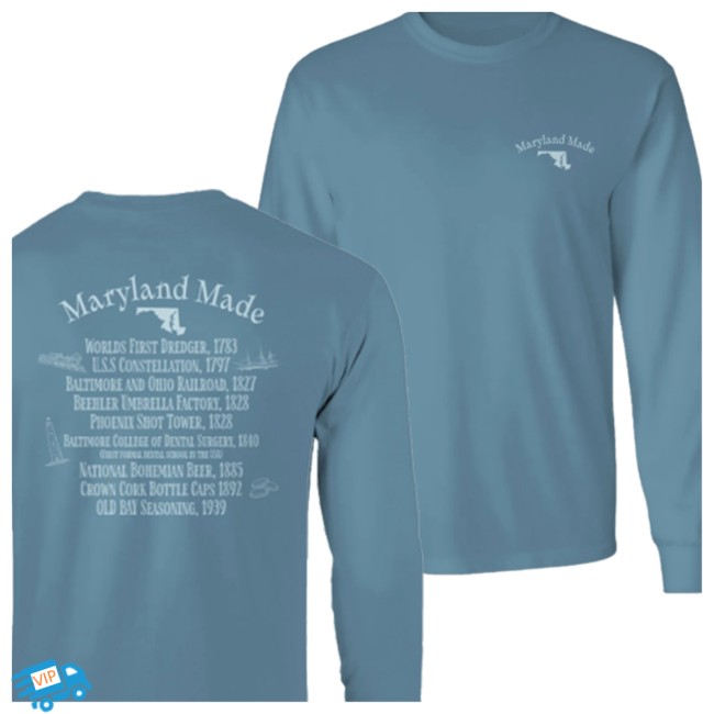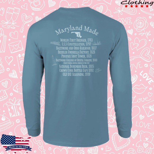 Here’s the info on the Maryland-themed ice-blue long sleeve shirt from Route One Apparel — a popular local apparel brand celebrating Maryland culture and designs