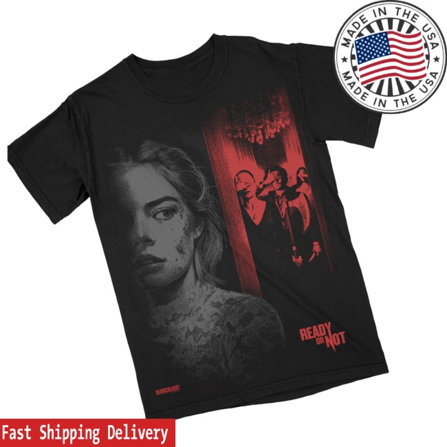 The Rucking Fotten Store Merch Ready Or Not They’re Coming One Sheet T-Shirt is a striking horror-inspired graphic tee created by Rucking Fotten, a streetwear label known for producing limited-edition apparel based on cult films and iconic movie artwork.