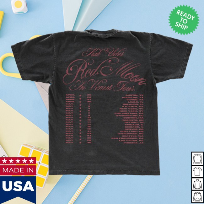 The Red Moon In Venus Tour T-Shirt II is an official merchandise piece inspired by Kali Uchis’ acclaimed Red Moon In Venus era and its accompanying tour. Designed for fans of her dreamy R&B aesthetic, this tee blends concert memorabilia with stylish streetwear.