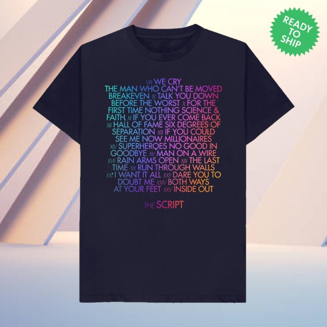 Celebrate the music of The Script with the The Script Store Merch The Script Tracklisting Navy Tee. This stylish navy t-shirt features the full tracklisting of the band’s iconic songs, making it a perfect keepsake for dedicated fans. Crafted from soft, high-quality cotton, it provides comfort and durability for everyday wear or concert nights.