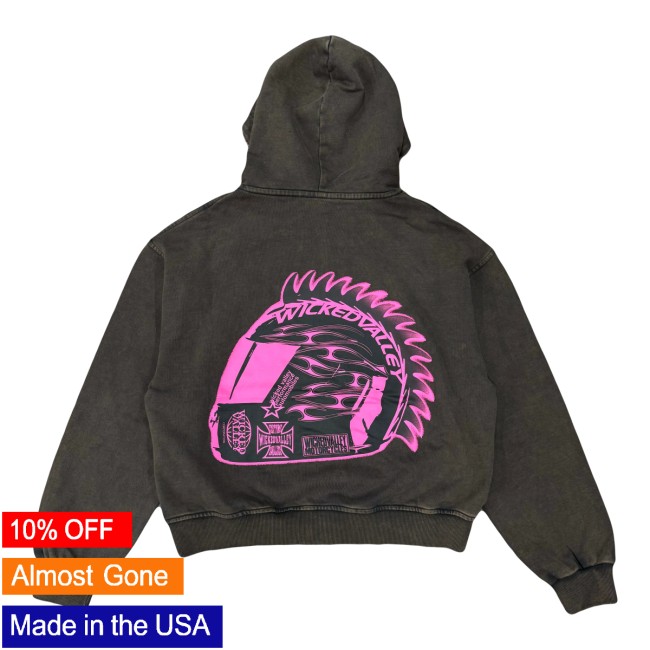 Made from a premium cotton-blend fabric, it features a full zip-up front, structured hood, and practical pockets for daily use. The OG Wicked Valley graphics paired with a charcoal colorway create a rugged, versatile piece that fits effortlessly into any streetwear rotation.